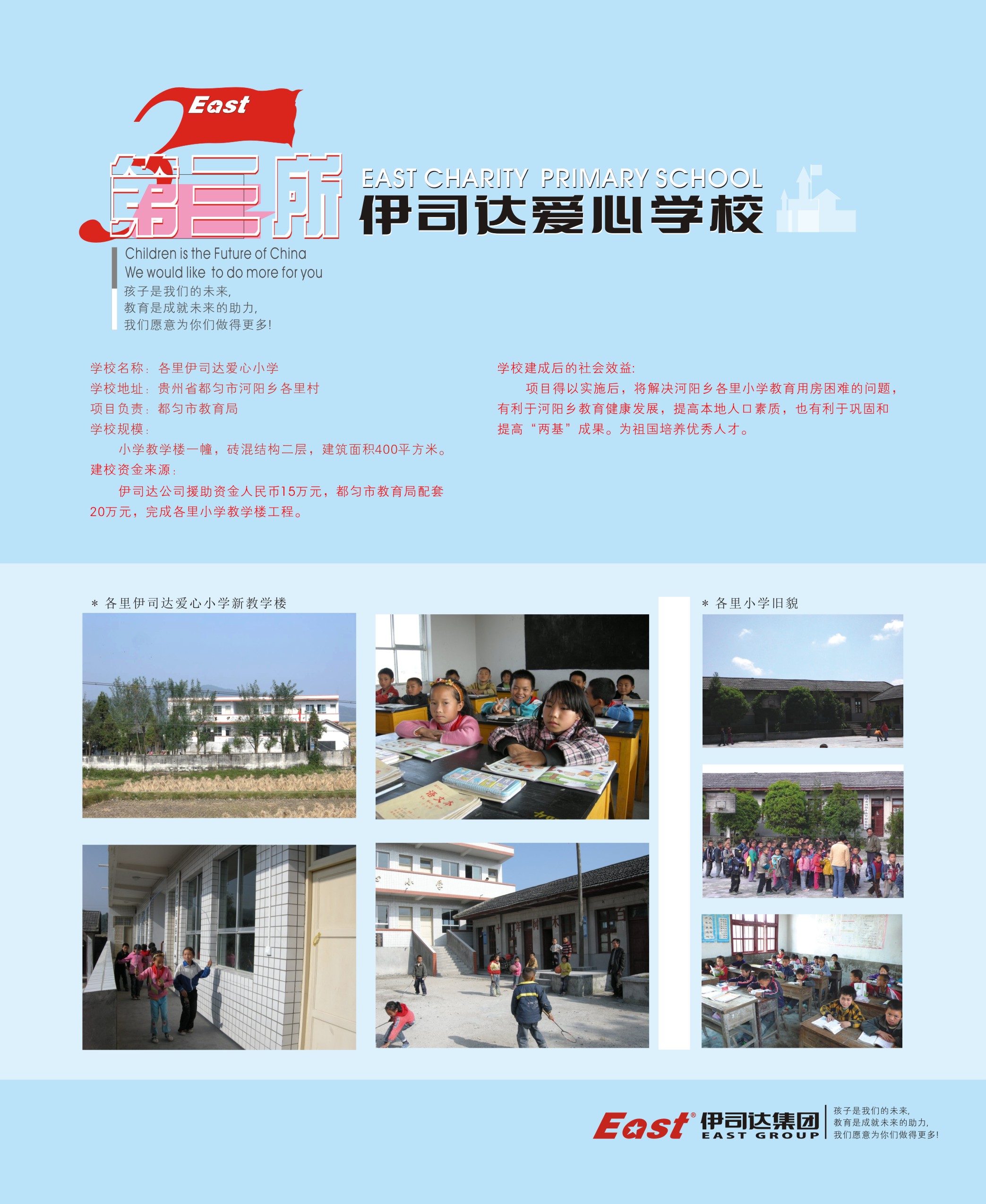 寧波伊司達潔具有限公司捐助資金人民幣15萬元,都勻市教育局配套20萬元,完成各里小學教學樓工程,項目完成后將解決河陽鄉各里小學教育用房困難的問題,有利于河陽鄉教育健康發展。
